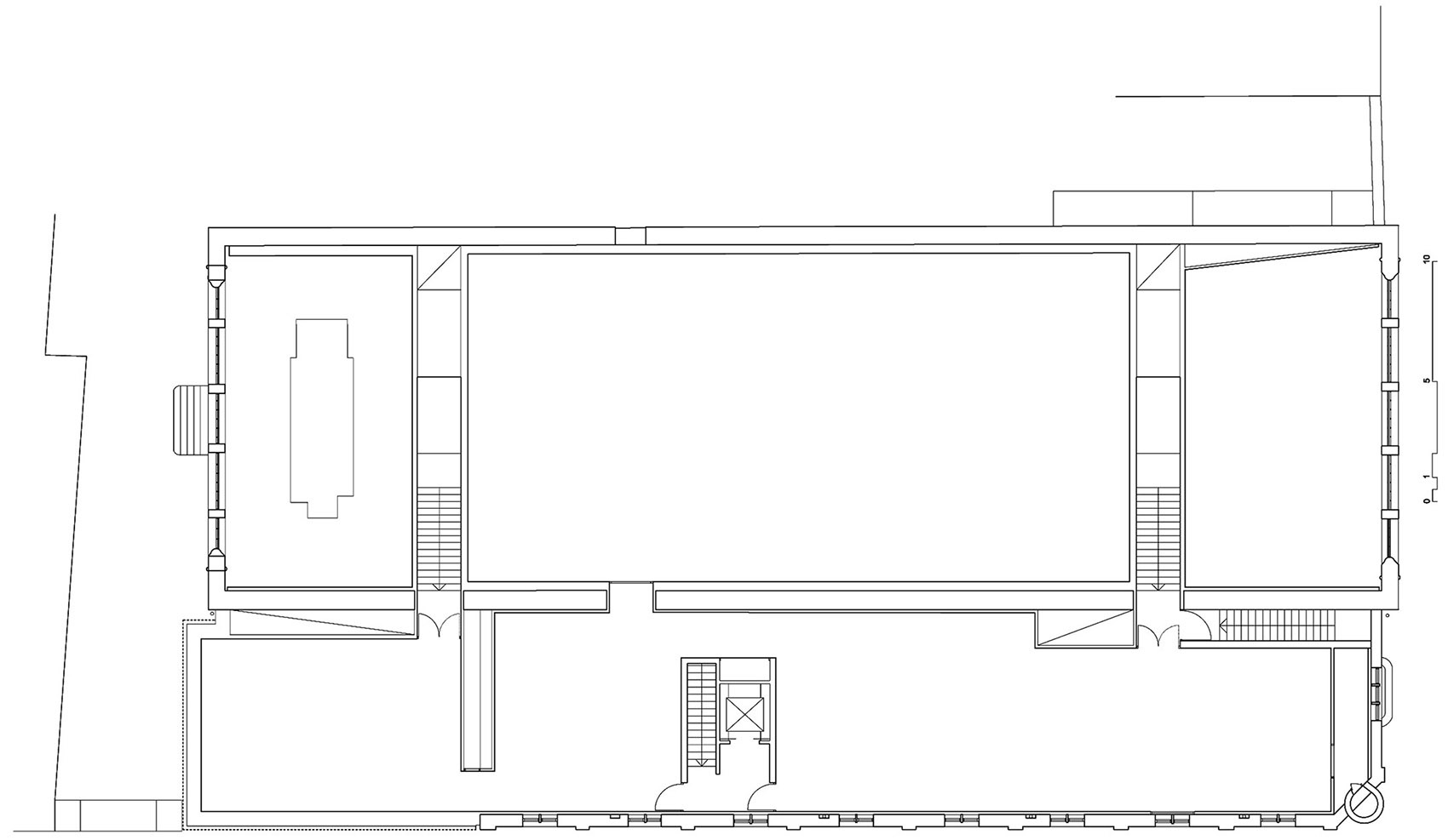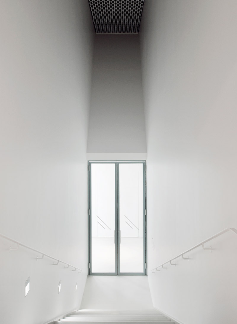 Inside, the building has been spatially reconstructed. Two new staircases allow the visitor to move in a loop between the grand turbine hall and the upper exhibition rooms. The staircases are each enclosed between two walls, which functions to divide the program of the turbine hall into three separate spaces, housing in addition to exhibition spaces a children’s studio and a separate loading area (in fact also used for exhibitions).