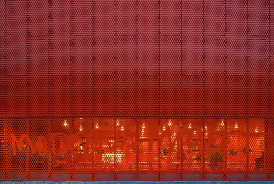 ▼博物馆外观局部,使用橙色的穿孔板作为外表皮,partial exterior view with the perforated orange façade