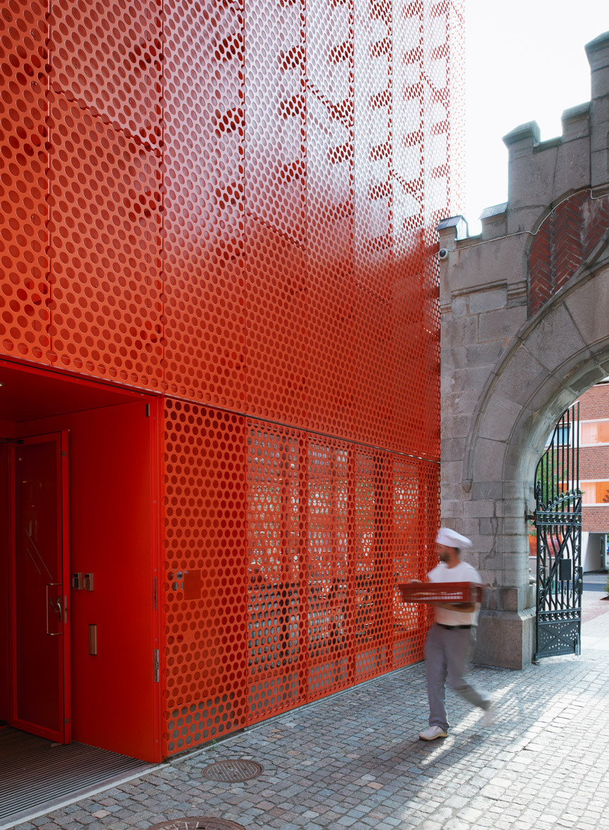 Seen from the exterior a new extension marks the arrival of the new museum. The extension provides a new entrance and reception space, as well as a cafeteria and a new upper gallery. Its perforated orange façade both connects to the existing brick architecture and introduces a contemporary element to the neighborhood. The perforated surface gives the façade a visual depth, and is animated through the dynamic shadow patterns which it creates. The ground floor is fully glazed so that sunlight is screened through the perforated façade.