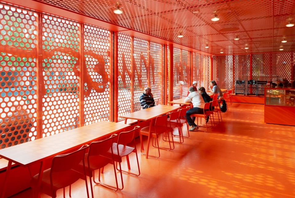 ▼博物馆室内餐厅局部,首层采用玻璃外墙,光线透过穿孔板照进室内,partial interior view of the restaurant with glazed ground floor, making sunlight screened through the perforated façade
