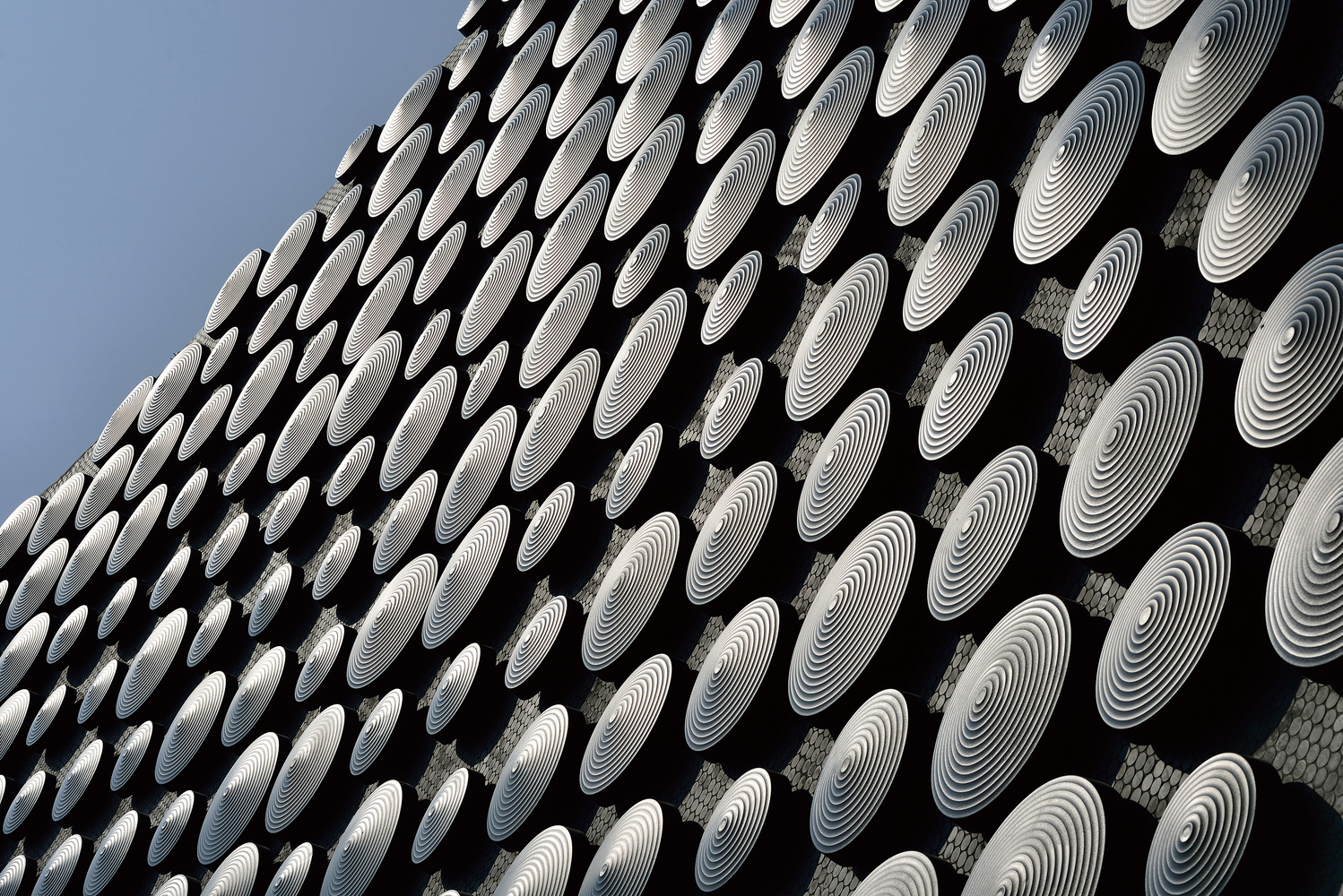 实量体建筑的外观由36,000多片铸铝圆盘外挂于弧型墙面所构成,以现代数码化的设计呈现古老铜器上的龙纹及云纹。当阳光移动时,经由圆盘的反射,“在云中移动的龙”会在此独特设计的弧形立面上呈现出来。