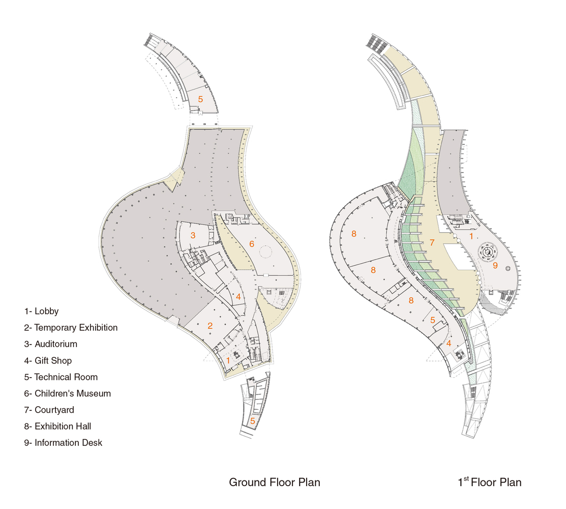 这三个各具特色的造型具有不同的功能:由于典藏品对自然光相当敏感,因此实量体(源自浓墨)主要为典藏与展示空间;玻璃与钢柱所形塑的虚量体(源自飞白)中,则为大厅、餐饮、图书馆、办公室等空间;而第三笔划的渲染穿越过前两个交织的造型,将所有的空间联系起来。