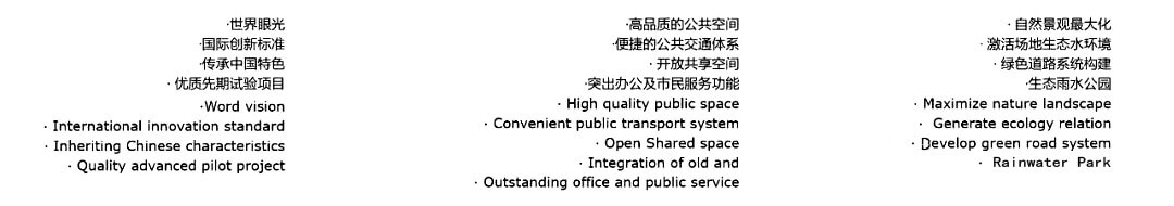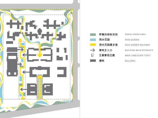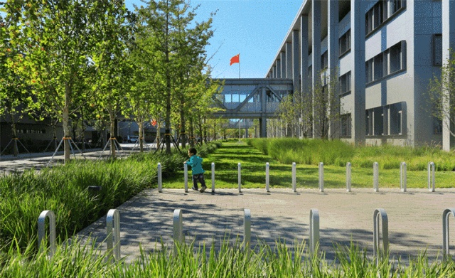 园区不设围墙,通过自然景观将园区内外连接为一个整体,雨水花园的设计让自然更好的融入人们的生活,在将园区外自然景观引入到内部地块的同时将内部景观花园作为连接建筑物的主要景观轴线,打破景观与建筑的硬性隔阂,将园区内的“创新共享生态”内核无限延伸至园区外乃至整个雄安新区。让人与建筑、人与景观融为一体,和谐共存。