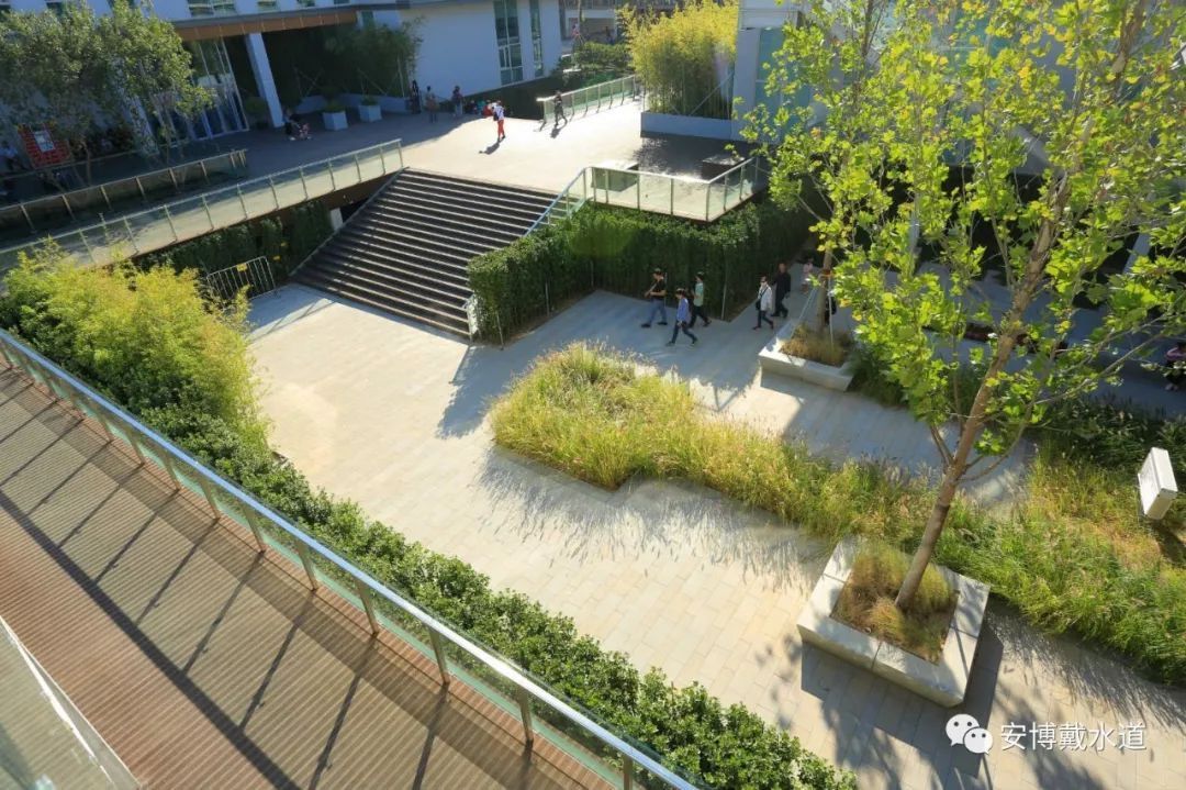 园区铺装大面积采用PC混凝土砖与透水铺装材料,铺装基层将石粉、岩片、云母片等废弃资源再次利用,实现了建筑垃圾资源化利用,且施工及维护成本低。