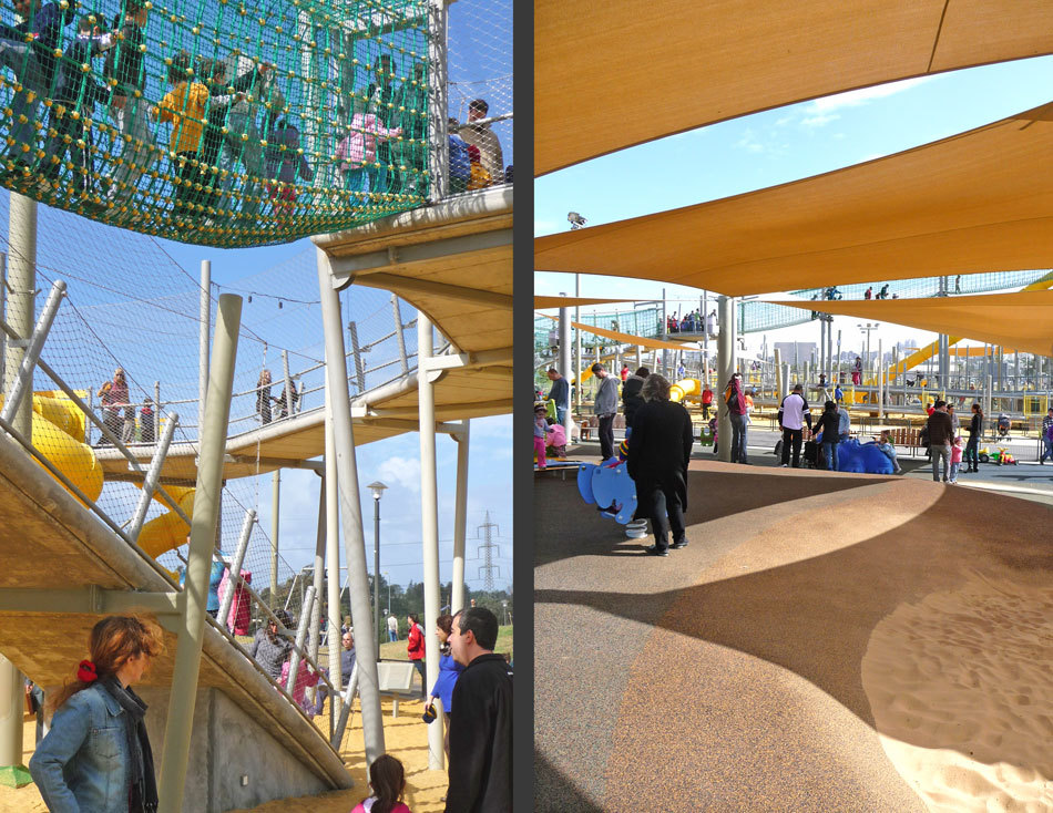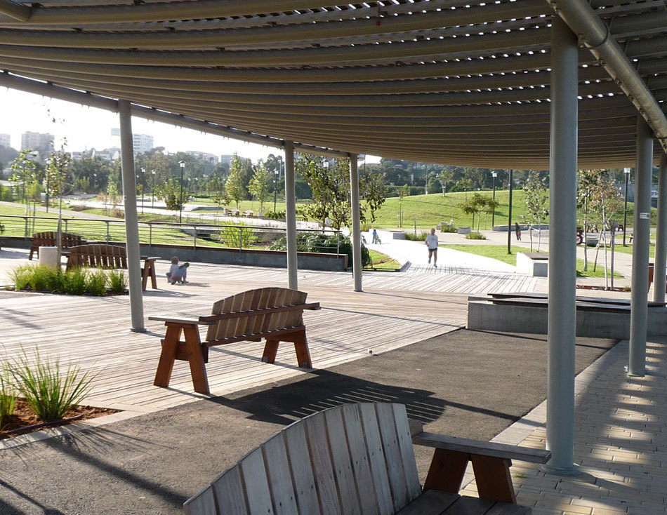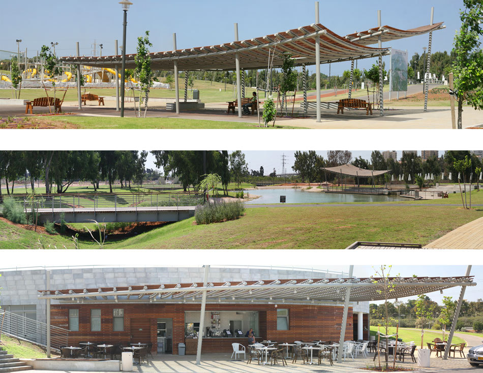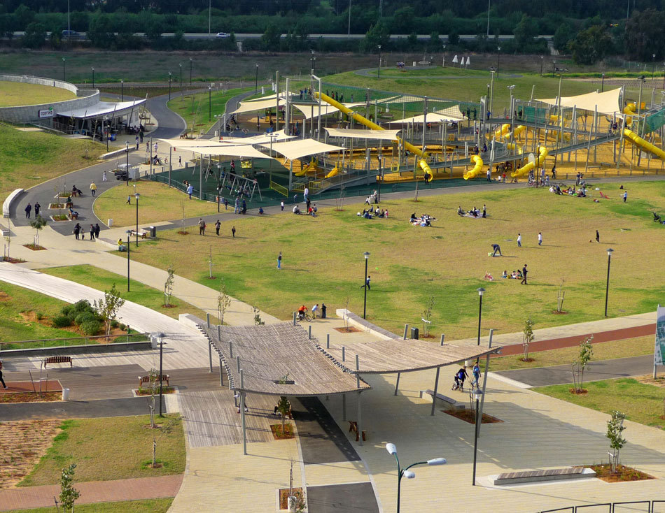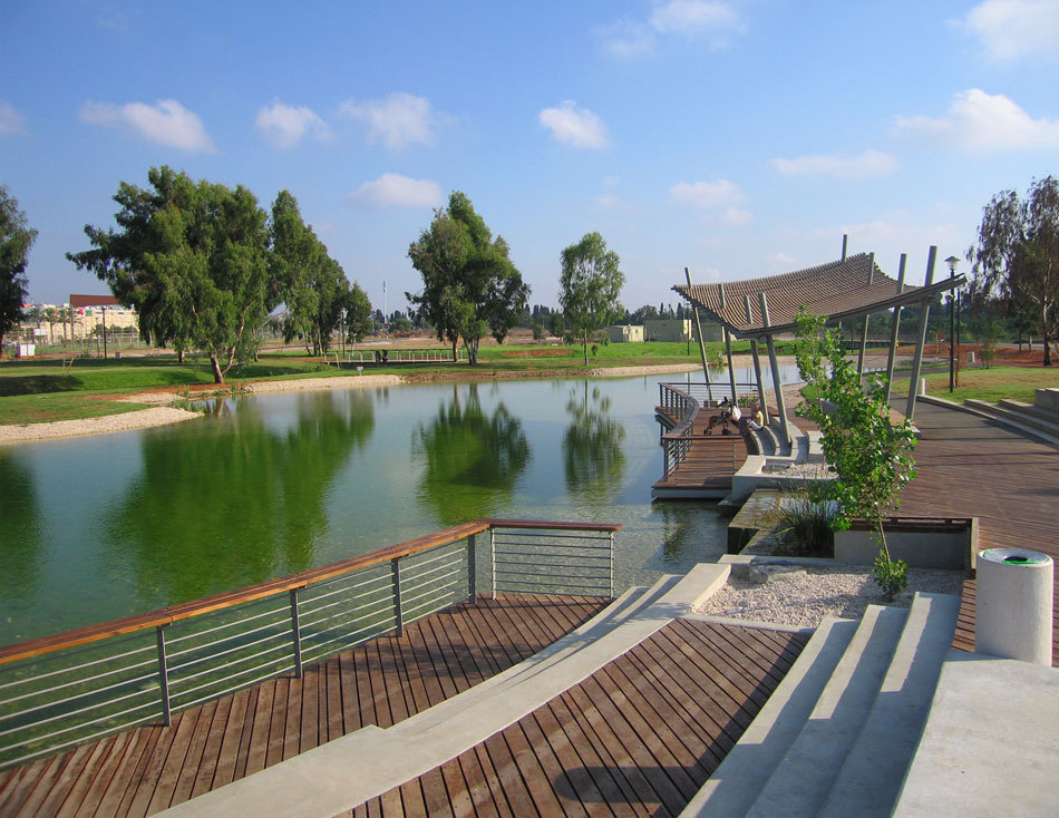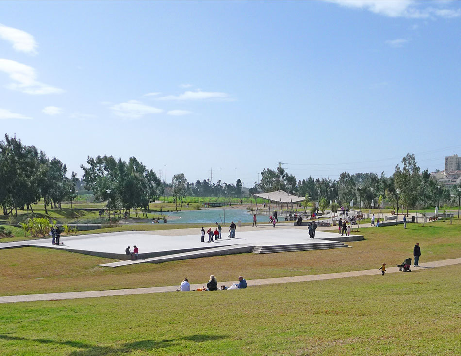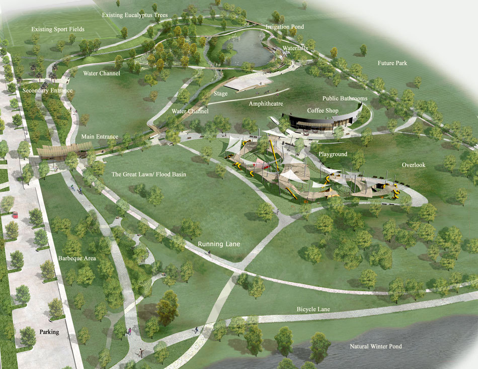 这个新市政公园位于一个具有历史意义的泛滥平原上。大型的冬池未让该区域发展成住宅区,却成为蚊蝇繁殖地。所以Shlomo Aronson Archhitects事务所决定将前面16公顷(40英亩)的区域建成一个充满活力的公园,满足用户的第一波需求,希望公众能及时发现冬池的价值和魅力所在(野生动物繁多),保护冬池。该休闲公园第一阶段的核心建造理念是“运动”,展现自然过程和区域人流。该运动体现在2维的道路布局,以及三维的建筑、阴凉结构和定制的游乐区设计中。公园的整个灌溉系统基于废水回收设计的。