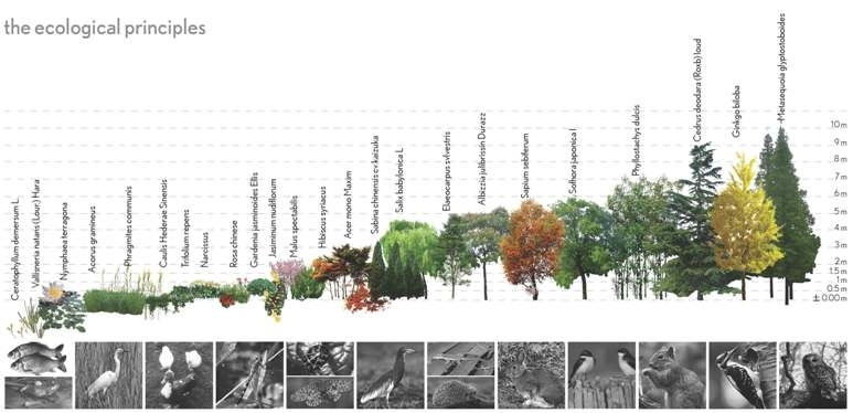 Plants: local plants only, with strong anti-reversion forces, certain capacities of purification, comprehensive usable value and thus following the principles of sustainability