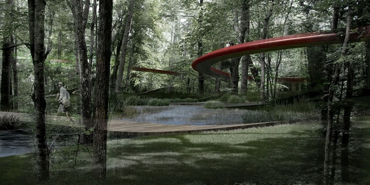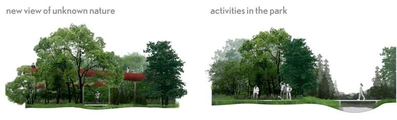 This proposal reflects a way to reverse the traditional dominating-dominated relationship of humans with nature. Elements are carefully planned to create an ecologically sustainable system with smallest financial investment and outsideintervention possible. The park first develops plants, water, and land. Then, respectfully around and between these elements, the Path of Experience, weaving up to 4m above ground, allows visitors and local residents an extraordinary experience. Great effort is made to re-create and ensure natural habitat for animals and birds to settle-down, breed, and nest. The exact opposite of a standard park, the design utilizes the site’s potential and helps nature return to its intended beauty. The wetlands are connected in non-intrusive ways to surrounding urban areas by bus and ferry.