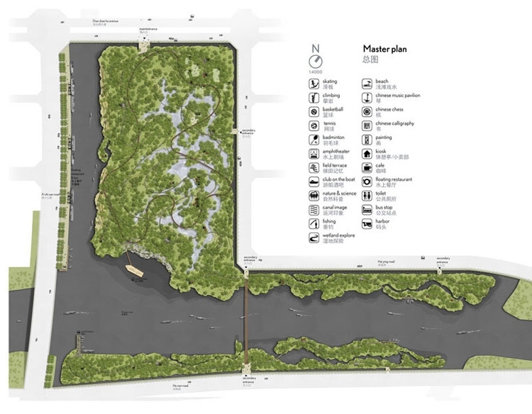 During rainy periods, the rainwater is collected at the lower areas and purified by plants and natural filter systems. After rainstorms, surplus water drains away into the Dian Pu river. The collected water nourishes the park and, during the dry seasons, river water (or even city gray water) can be directed into the wetlands to be purified and used for natural irrigation. The wetland assures the purity of the water and provides the basis for an ecological park. This is especially important in this region, asfreshwater resources are limited and polluted.