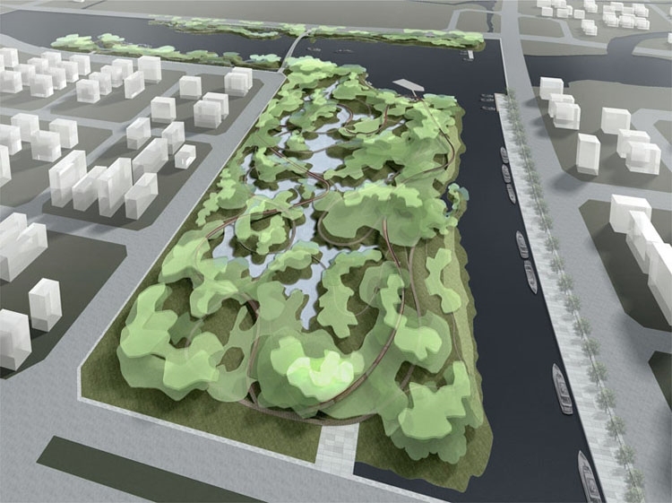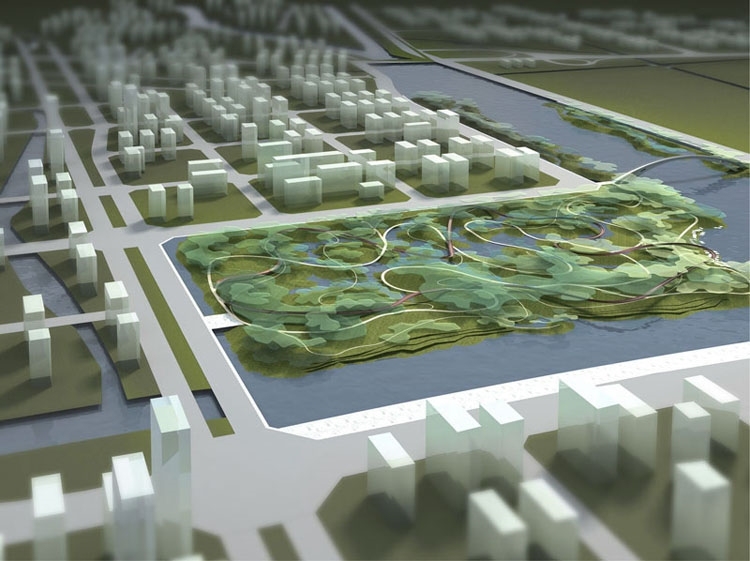 设计将平坦的地块砌高以在中部形成低洼,汇集湿地和周围山丘以保护中心地带免受洪水侵害。新的起伏地形使自然生物及植物种类更多元化,也避免了外来土地的使用。