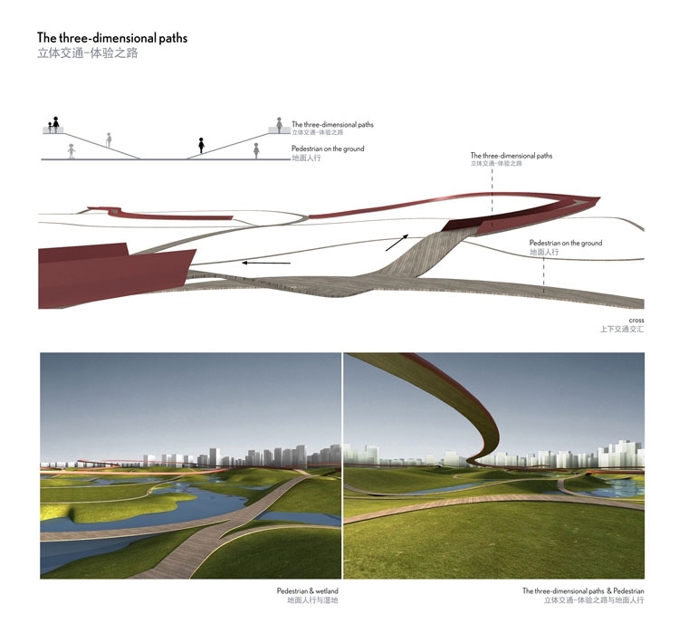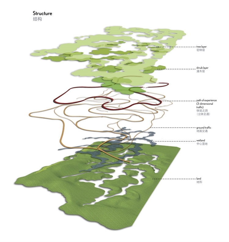 公交线路把地块与外部城市相连,并有水运及游船停靠港口。设计沿用水渠环绕地块周围,限制出入口数量,以保护自然生态系统。立体交通路线贯穿园内,仅行人可进入场地,并且行人也只能逗留于体验之路,活动空间和平台。