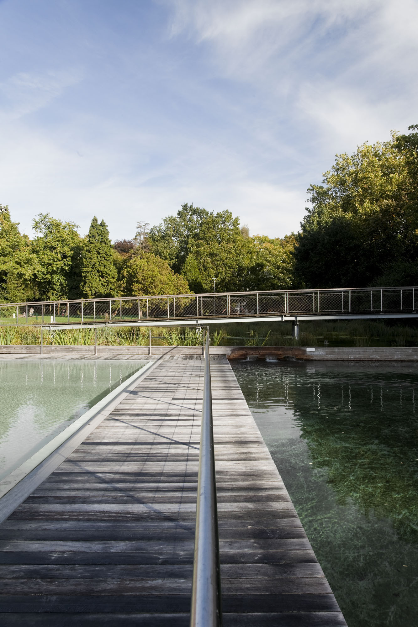 同时,许多现代设计元素也被融入到公园内,例如一个具有十八世纪风格的混凝土泳池被改造为一个池塘,在周边种满了各种植被,有了更多的植被,该区域的生态环境便得到了很大的改善。与此同时,再引进现代的先进技术,生态水处理技术来创造一个新的水生生态系统。