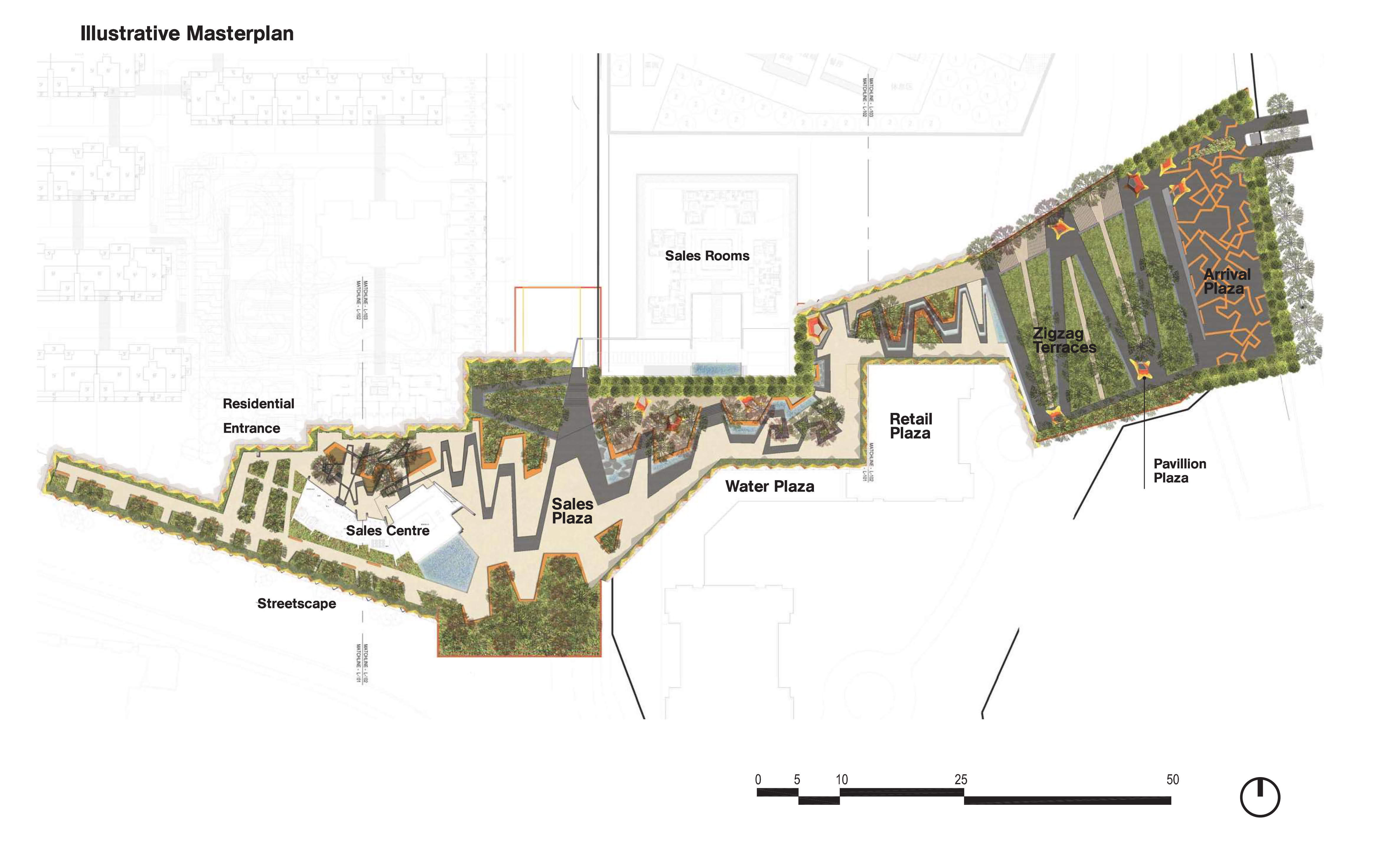 高差明显的特殊地形为人行步道的设计带来挑战,但同时为从上部停车场到最底层售楼中心的汽车通道提供了便利,形成一道独特的“山形”动态景观。