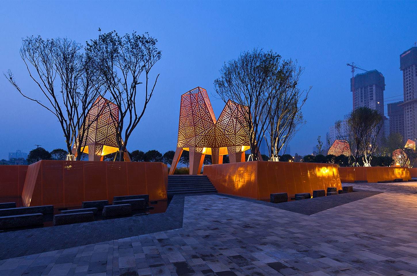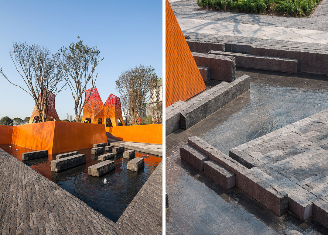 从广场一直流向销售中心的水元素是凤鸣山公园的重要部分。设计师采用了水渠、水池、喷泉等不同的水景效果,不仅起到降温的作用,潺潺的流水声和水景营造出的氛围更是为游人展示了一道迷人的风景。