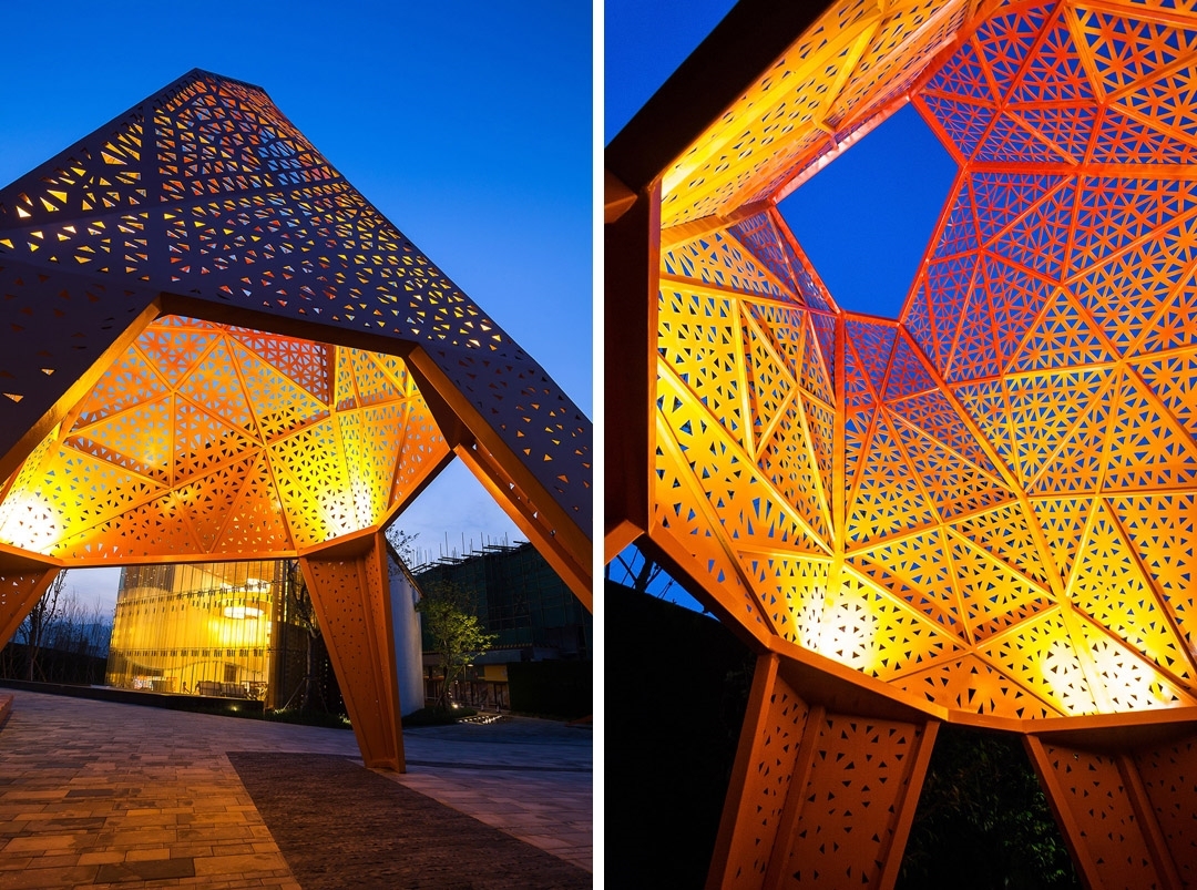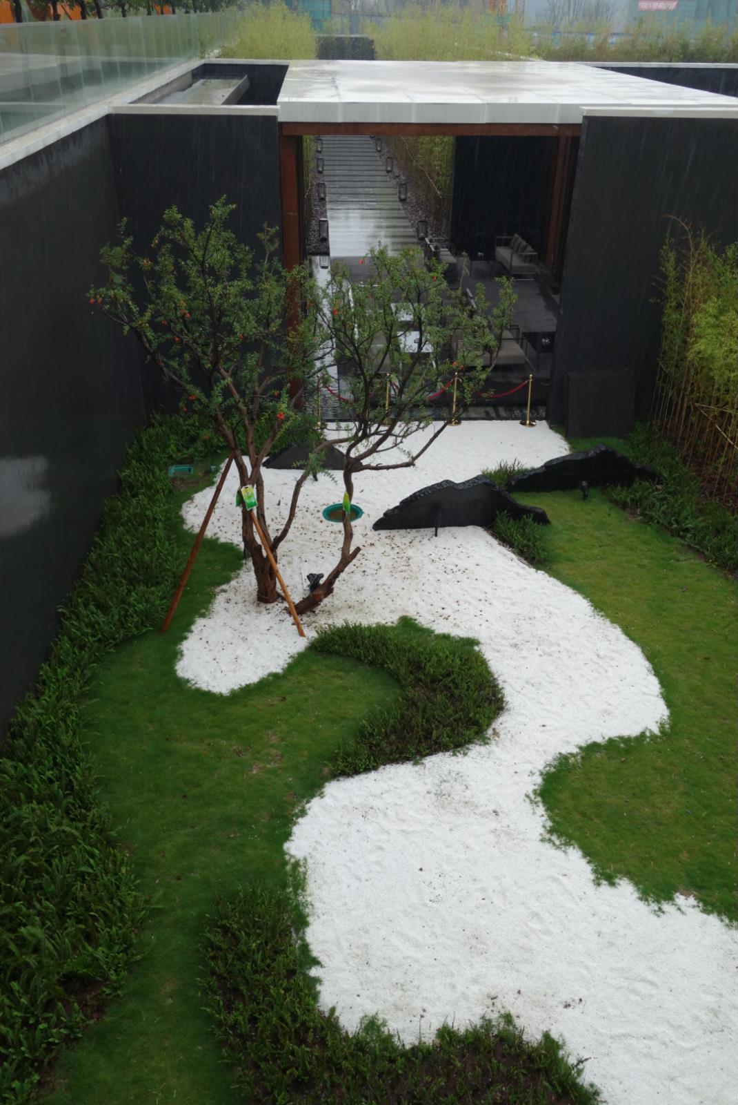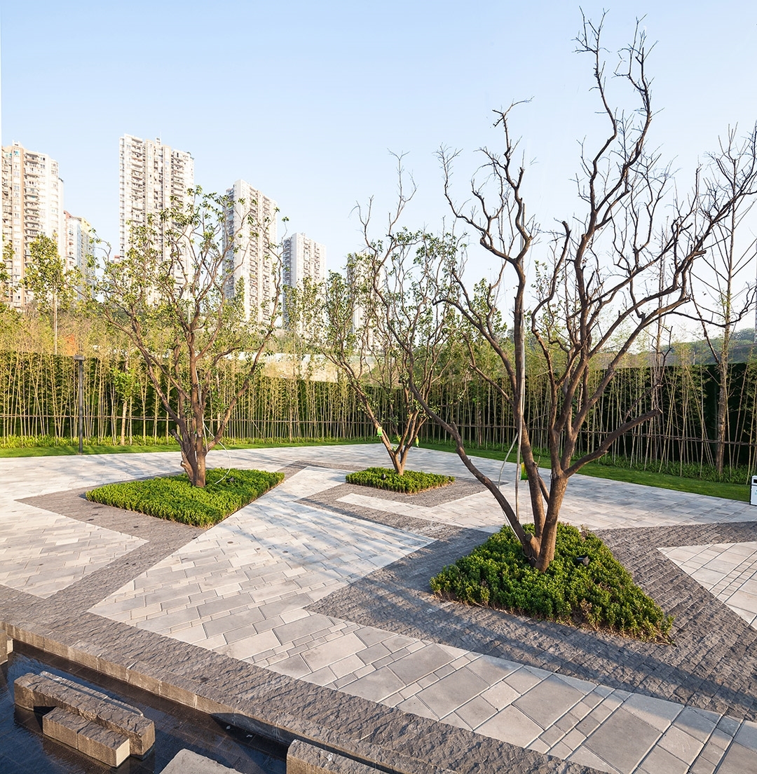 重庆市沙坪坝金色悦城的景观示范区,由MSP玛莎·舒瓦茨及合伙人景观事务所设计,据该事务所微博称,项目设计的灵感来源于重庆本地的雨雾气候以及山水台地等自然地理特色。