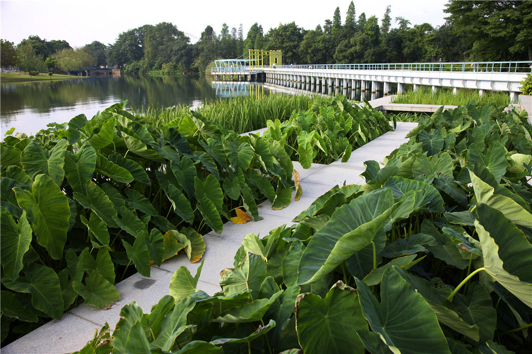 c.水际植物群落:根据水位的变化及水深情况,选择乡土植物形成水生-沼生-湿生-中生植物群落带,所有植物均为野生乡土植物,使岐江公园成为多种乡土水生植物的展示地,让远离自然、久居城市的人们,能有机会欣赏到自然生态和野生植物之美。同时随着水际植物群落的形成,使许多野生动物和昆虫也得以栖居、繁延。所选野生植物包括:水生的荷花,茭白,菖蒲,旱伞草,茨菇等;湿生和中生的包括芦、苇象草,白茅和其他茅草,苦苡等。