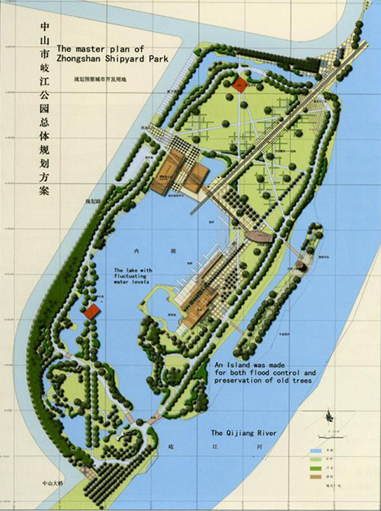 岐江公园位于广东省中山市区,总面积10.3公顷,园址原为粤中造船厂,设计强调足下的文化与野草之美。其中水面3.6公顷,水面与岐江河相联通,而岐江河又受海潮影响,日水位变化可达1.1米。