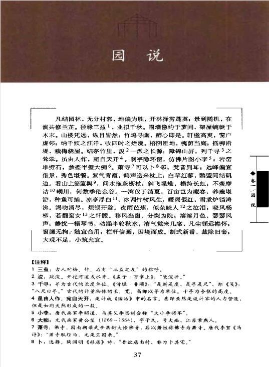 《园冶》全书文字约18000字,各类插图253幅,分作三个部分:卷一是兴造论,下有园说、相地、屋宇、装折;卷二是栏杆;卷三是门窗、墙垣、铺地、掇山、造石、借景等内容,是明代造园技术经验全面、精辟的总结。*有味道的是卷一中的兴造论、园说和相地三章,计成对于园林艺术的体会,被那种简练雅致的文字表现得淋漓尽致。当然,《园冶》更重要的是对中国传统园林艺术、技术作了集中的阐述,全书可谓是“理论与实践相结合”。