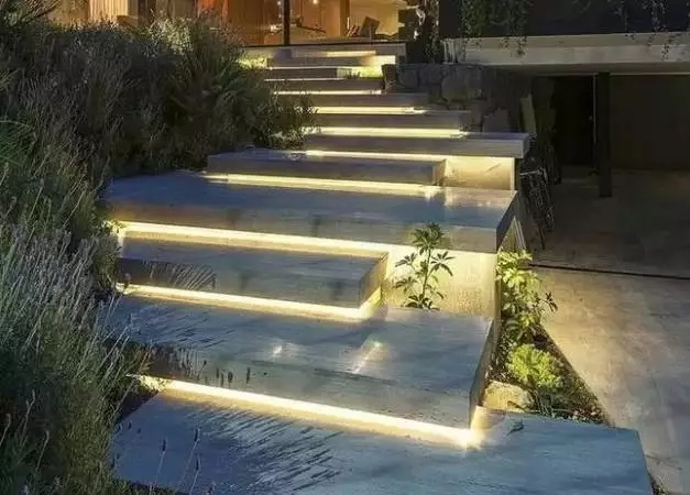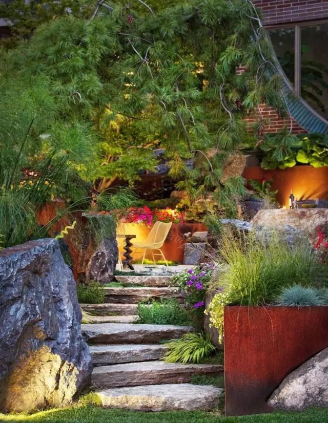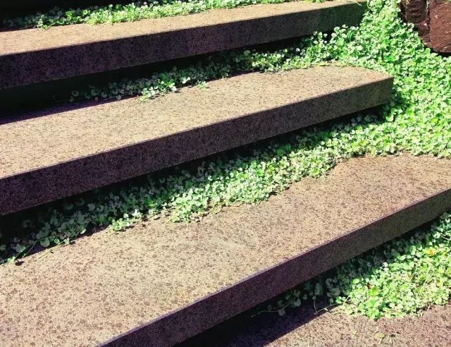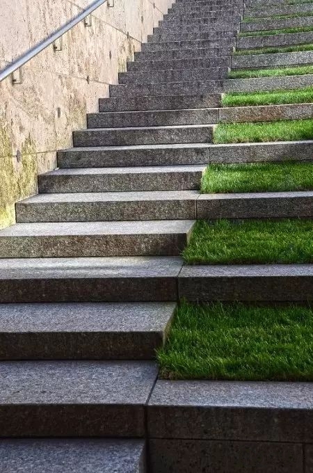 台阶可以是规则的,也可以是自然形状的。自然式的石阶与草坪做一些变化交融,既可以满足行走的需要,又能给人以安逸闲适的感觉。