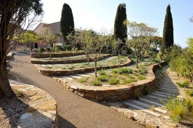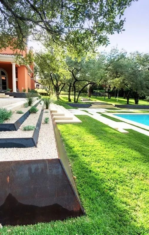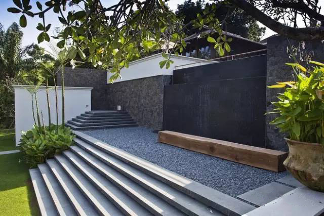 利用台阶解决调养是非常实用的方法,台阶可以是规则的,也可以是自然形状的。自然式的石阶与草坪做一些变化交融,即可以满足人们行走的需要,又能给人以安逸闲适的感觉。大面积的台阶应用,利用高差可以很好的体现恢弘伟岸的气势,凸显出尊贵华丽的建筑主体,不过得充分考虑人体工程学,避免带来疲累感。