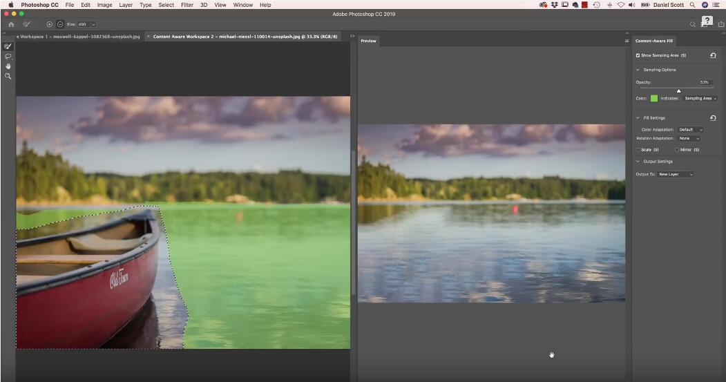 借助Adobe Sensei技术,您可通过全新的专用工作区选择填充时所用的像素,还能对源像素进行旋转、缩放和镜像。您还可以在其他图层上创建填充,从而保留原始图像。