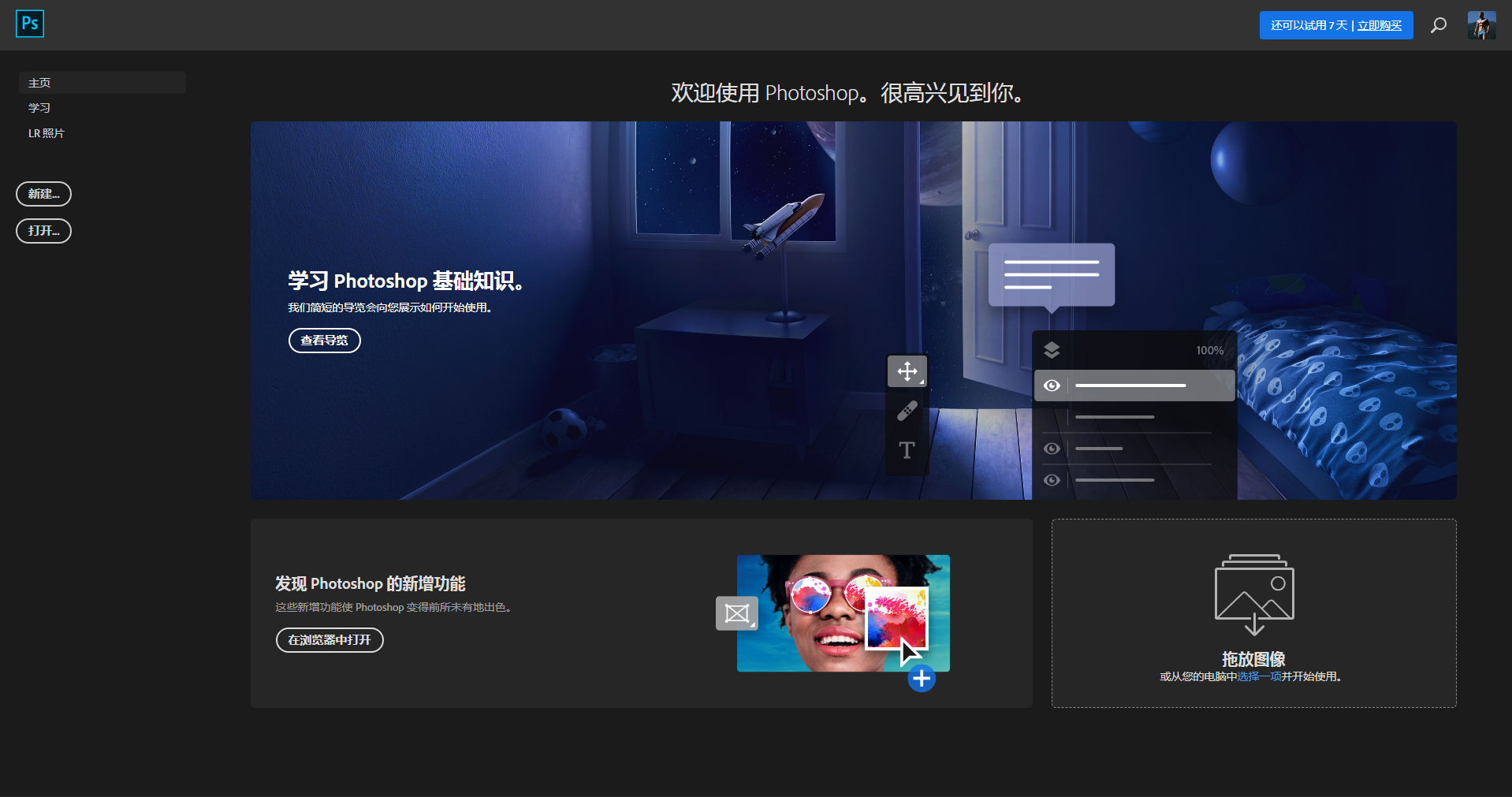 通过Photoshop主屏幕快速开始使用。随时访问主屏幕,以便了解新功能、访问学习内容,并直接跳转到打开的文档。